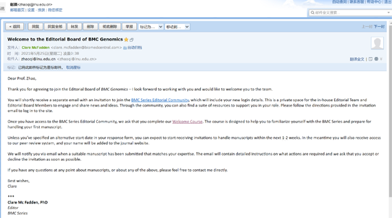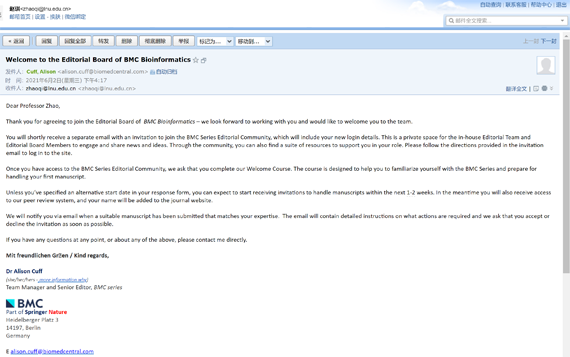 近日,马博在线手机版(大中国区)计算机与软件工程学院教授赵琪收到BMC出版集团Dylan Smith博士邀请,受邀分别担任BMC Genomics和BMC Bioinformatics编委。