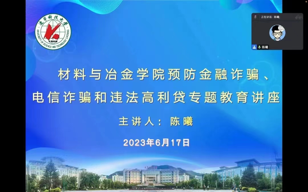 6月17日晚,材料与冶金学院举办预防金融诈骗、电信诈骗和违法高利贷专题教育讲座,学院全体学生参加讲座,专题讲座由马克思主义学院专任教师、材料与冶金学院辅导员陈曦老师主讲。