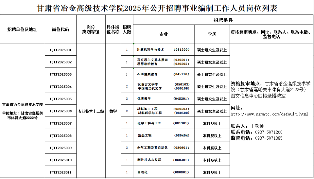 甘肃省冶金高级技术学院2025年公开招聘事业编制工作人员公告