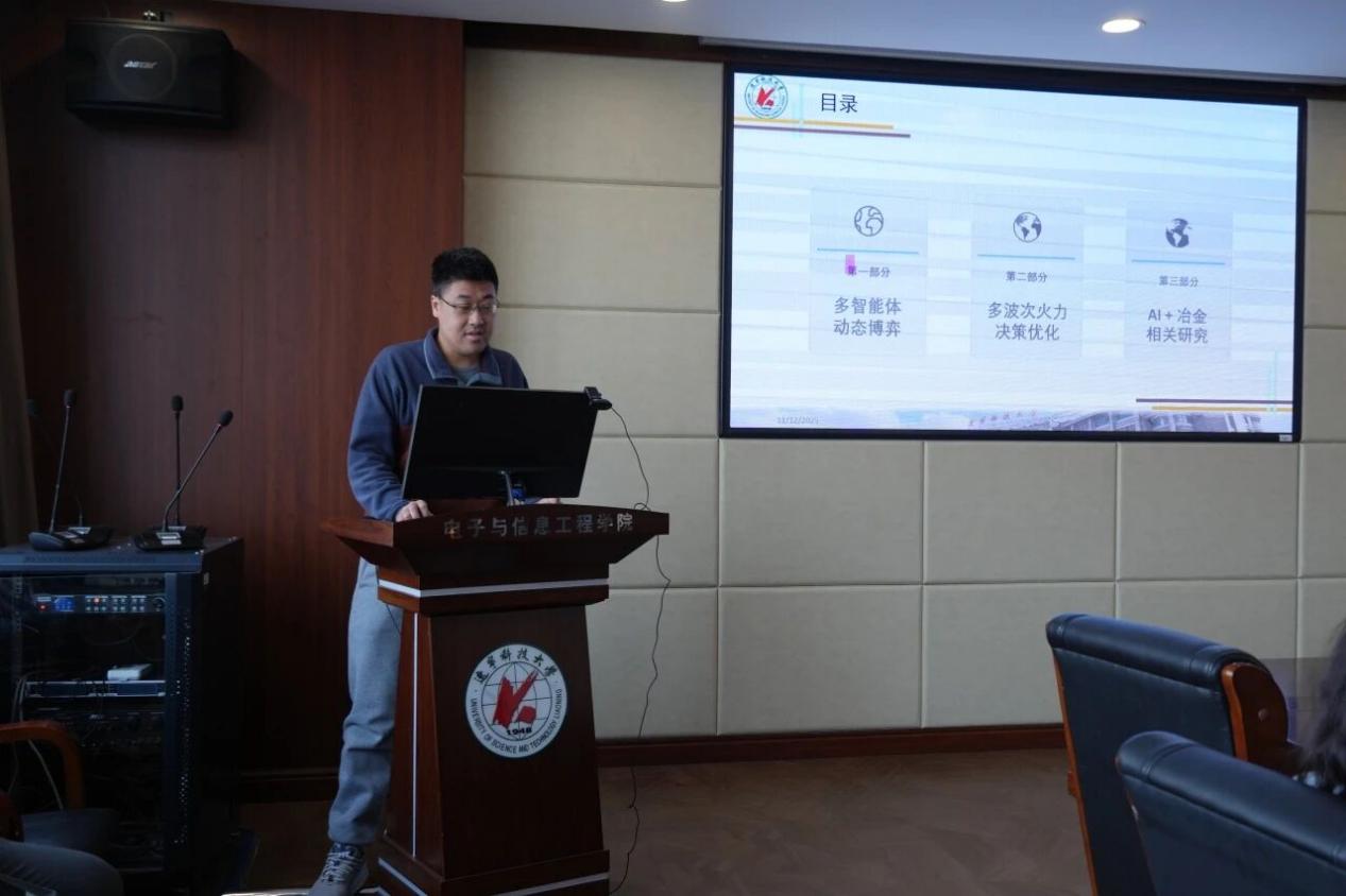 11月12日,电信学院于博闻楼313会议室开展学术报告会,报告会特邀The University of British Columbia访问博士王明星及学院副教授闫传博担任主讲嘉宾,分别带来《高光谱图像处理》《多智能体动态博弈与多波次火力决策优化研究》为题的学术分享。此次报告会由学院教授储茂祥主持,研究生导师、2024级及2025级研究生代表共同参加。