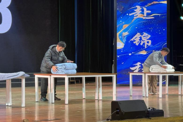在叠被子大赛环节,参赛选手们个个精神抖擞、胸有成竹。只见他们动作娴熟利落,有条不紊地展开操作:先将被子平铺展平,仔细抻平每一处褶皱,确保被面平整无瑕疵;随后精准定位、快速翻折,手掌翻飞间,被子的边角被拿捏得恰到好处;最后俯身压实、仔细捏线,指尖起落间,一道道棱角分明的线条便清晰呈现。转瞬之间,一床床方正挺括、形如“豆腐块”的标准被子整齐亮相,棱角笔直、面平线直,堪称“教科书式”示范。这一个个棱角分明的“豆腐块”,不仅展现了选手们过硬的生活技能,更彰显出当代大学生严谨自律、精益求精的青春风貌。