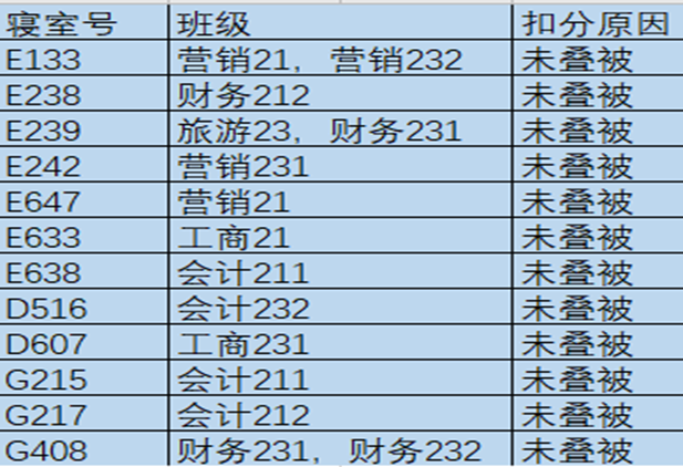 每天上午,工商管理学院对全体本科生宿舍进行检查。在检查过程中发现大多数宿舍能够保持整体干净整洁,不乱扔垃圾,桌面摆放整齐,对这些优秀宿舍给予表扬,也有一些寝室内务方面有待加强。现将检查结果通报如下: