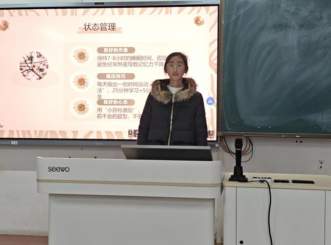 沈秀阳学姐围绕四大板块,为同学们梳理出清晰的期末备考路径。一、目标锚定:她强调期末成绩对评奖评优及未来机遇的重要影响,指出备考应从明确目标开始,以此引导复习方向;二、学习方法:她分享了“7:2:1”时间分配原则等科学策略,帮助同学们实现高效学习;三、状态管理:她强调良好的备考状态依赖于规律作息、适度解压与积极心态;四、避坑指南:她指出备考刷题应重“精”不重“多”,并强调“好记性不如烂笔头”,助力新生避开常见备考误区。整套备考思路逻辑清晰、操作性强,有助于新生高效冲刺期末。