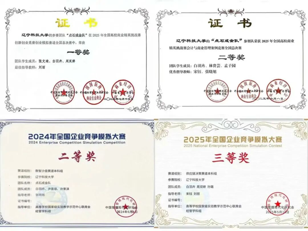 聚焦财务管理前沿议题,白羽卉以第一作者身份发表论文:《区块链技术在企业财务管理中的应用研究》《数字化时代背景下企业财务管理的转型升级路径》两篇论文被知网收录,分别发表于《今日财富》《中国商界》;《绩效评估在企业财务管理中的应用研究》《大数据视阈下企业财务管理的信息化建设研究》被万方数据库收录,刊登于《警戒线》《电脑校园》。此外,她还积极参与辽宁省教育厅课题“基于净零经济的辽宁工业企业精益绿色技术创新实现路径与对策研究”,将科研与区域发展需求紧密结合。 从国家级到省级竞赛,白羽卉始终是团队中的“核心力量”:国家级层面,7项荣誉涵盖多领域——2025年全国高校商业精英挑战赛创新创业竞赛创业模拟赛道全国一等奖、会计与商业管理案例竞赛全国二等奖、品牌策划竞赛全国二等奖,2024-2025年全国企业竞争模拟大赛数智沙盘赛道二等奖、供应链决策赛道三等奖等,多次助力团队夺冠;省级层面,斩获第三届辽宁省财务大数据分析大赛二等奖、辽宁省大学生商科综合能力大赛三等奖等3项奖项,用实力证明在商科领域的竞争力。