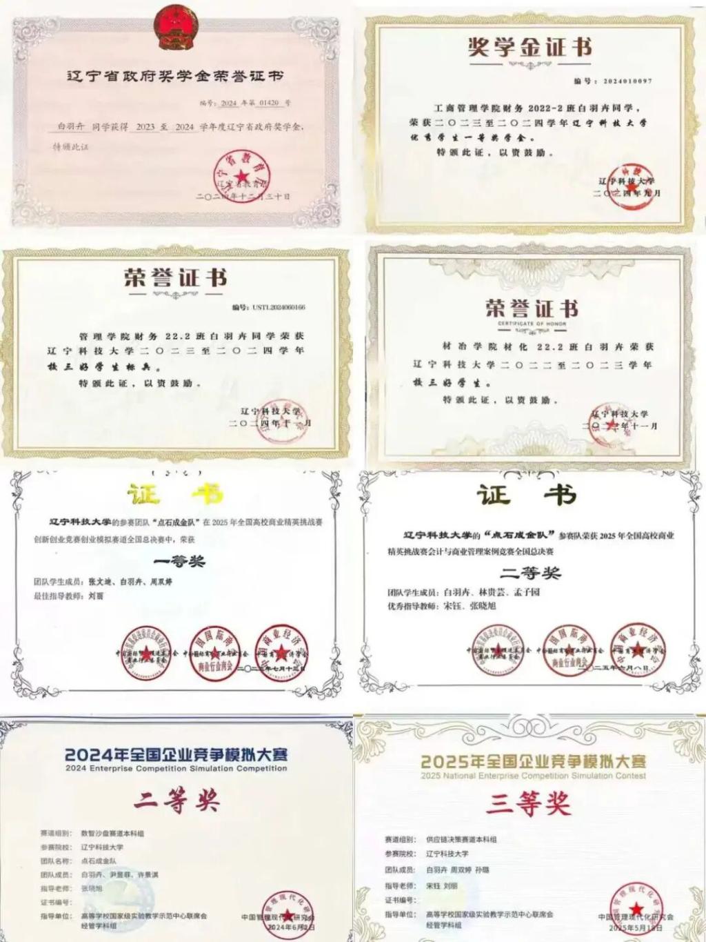 凭借过硬的学业表现,白羽卉获得了辽宁省政府奖学金、校一等奖学金、校二等奖学金,还先后获评“校三好学生标兵”“校三好学生”称号,用荣誉证明“品学兼优”的综合实力。