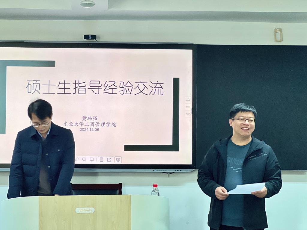 2024年11月6日,工商管理学院在明信楼B513室成功举办研究生导师培训会,邀请东北大学工商管理学院黄玮强教授做经验交流专题培训,学院全体研究生导师参加会议。培训会由学院副院长宋伟主持。