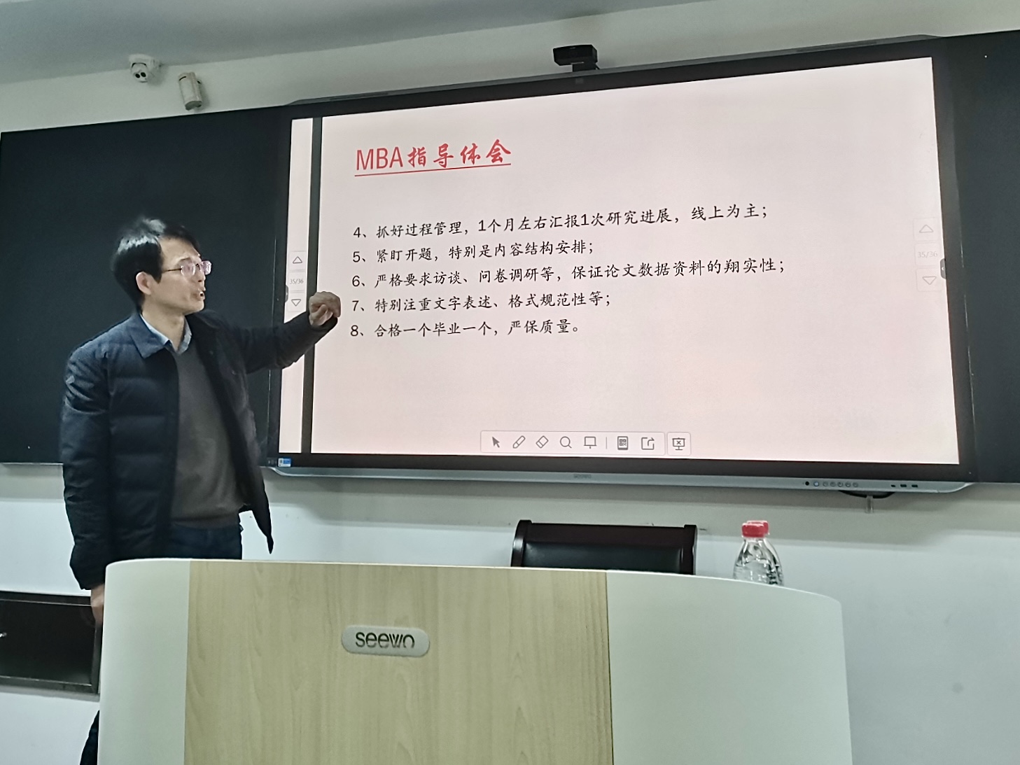 会议伊始,宋伟代表学院向黄玮强教授前来授课表示欢迎和感谢,并对黄教授进行了详细介绍。随后,黄玮强教授结合自身指导研究生经历与导师们进行了经验交流分享,他从研究生指导总体情况、硕士研究生指导环节及实施安排、各指导环节的具体做法、指导体会等四个方面进行了详细阐述,以2024年研讨计划安排为例,介绍了每周研讨的具体开展情况,他表示研究生导师应定期关注研究生研究进展,抓好论文共性问题的警示,切实解决研究生在研究过程中存在的各类问题。同时,黄教授还结合MBA学生的学习特点,着重介绍了指导MBA学员的相关经验。会后,导师们就研究生指导的一些困惑和问题与黄教授进行了提问交流。