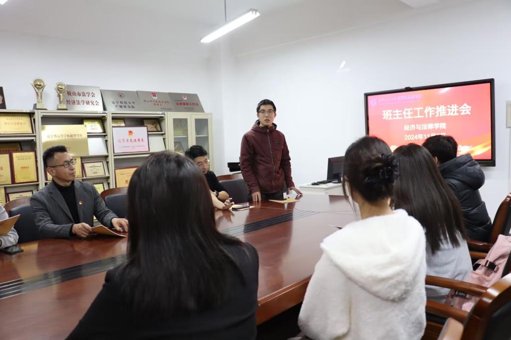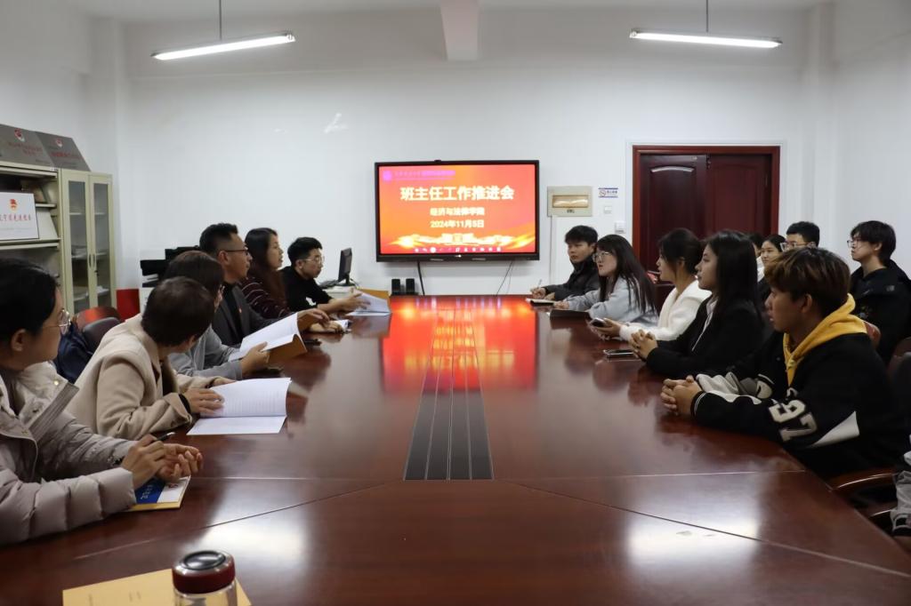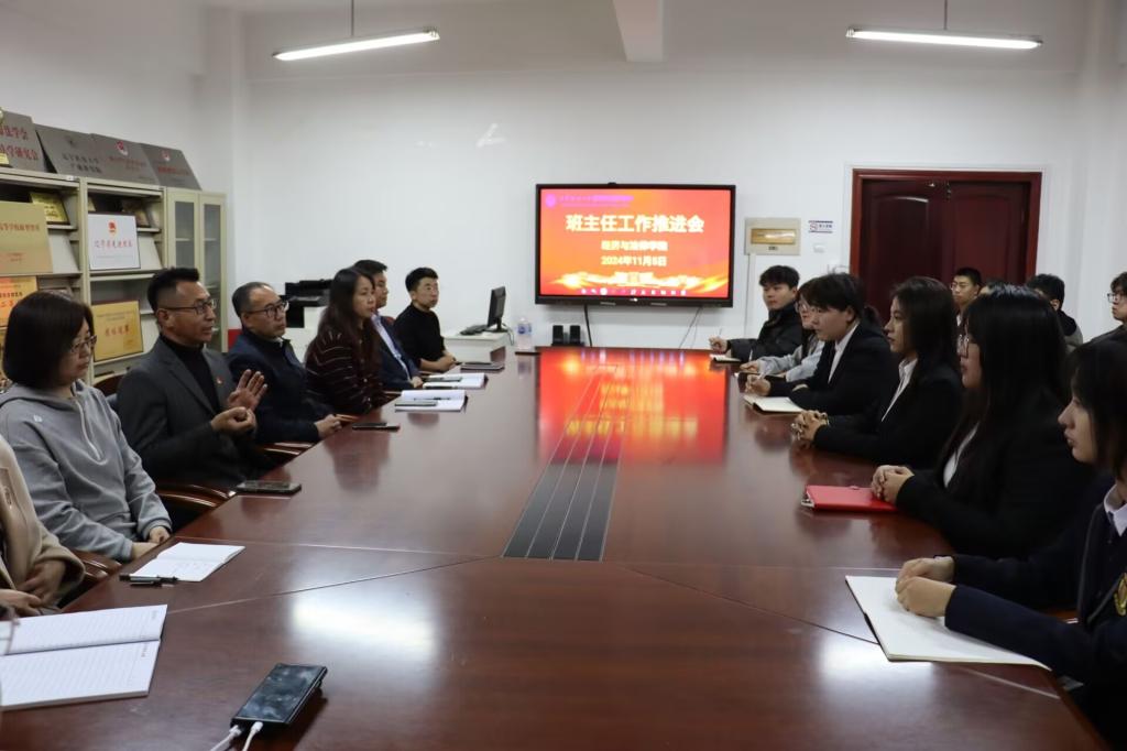 11月5日,经法学院于博识楼A305召开2024级班主任对接及工作推进会。学院党委书记赵智博、党委副书记张国华、学办主任齐艳萍、团委副书记张鹏飞及2024级班主任、班委会成员参加了会议。