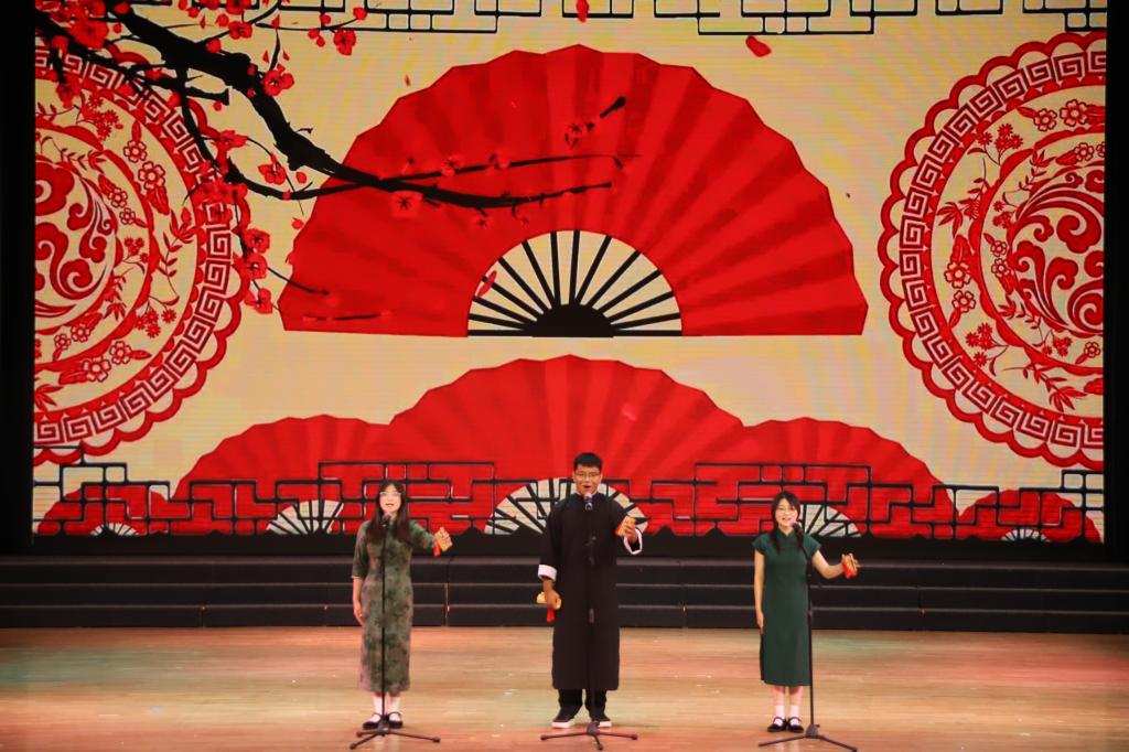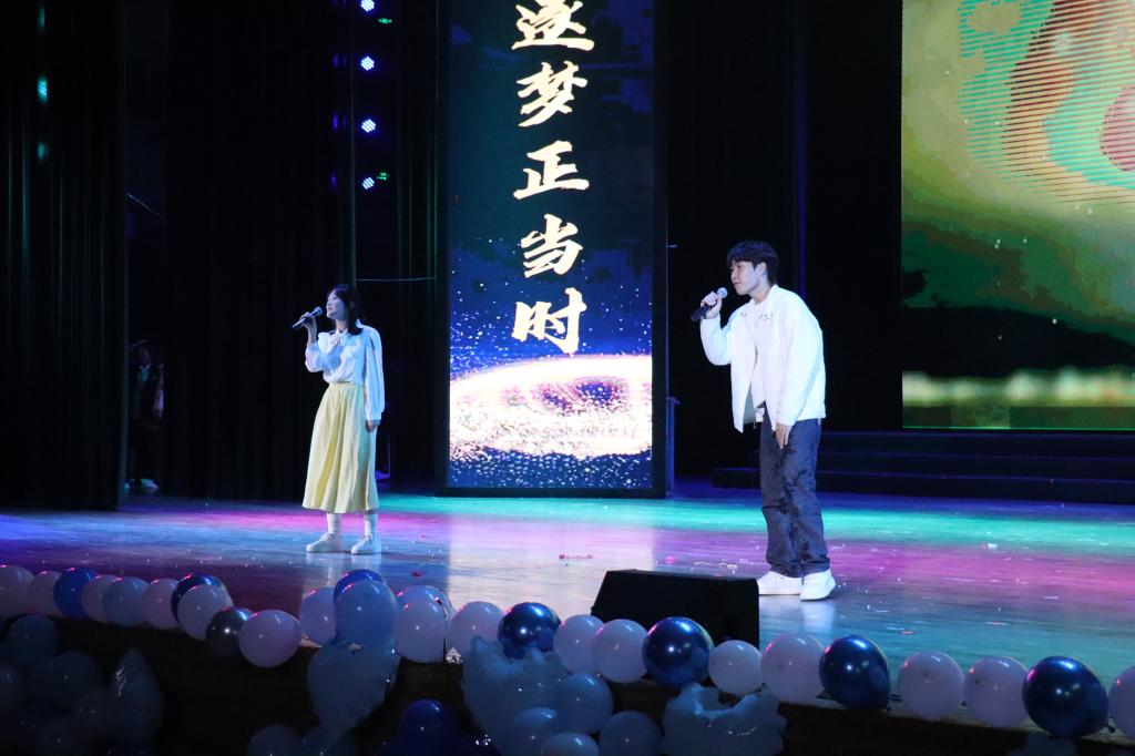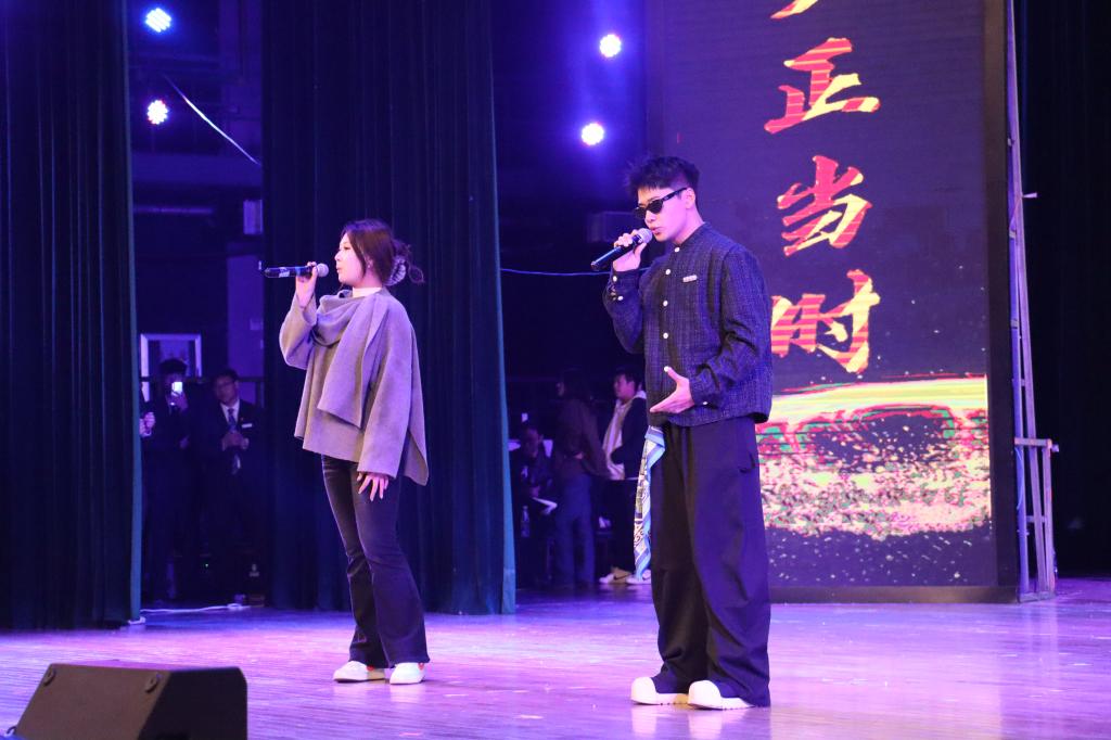材冶学院学办副主任尚思奇深情演唱《如愿》,歌声中满载着对新生的祝福与期待;快板《科大里面看升旗》妙语连珠,诙谐中蕴含深意,展现了青年学生对红色精神的传承与热爱。经法学院副院长温馨演唱的《左邻右舍》声情并茂,提醒同学们珍惜真情、互助共进。乐队弹唱《For Whom the Bell Tolls》以激情澎湃的旋律,再次点燃全场热浪。