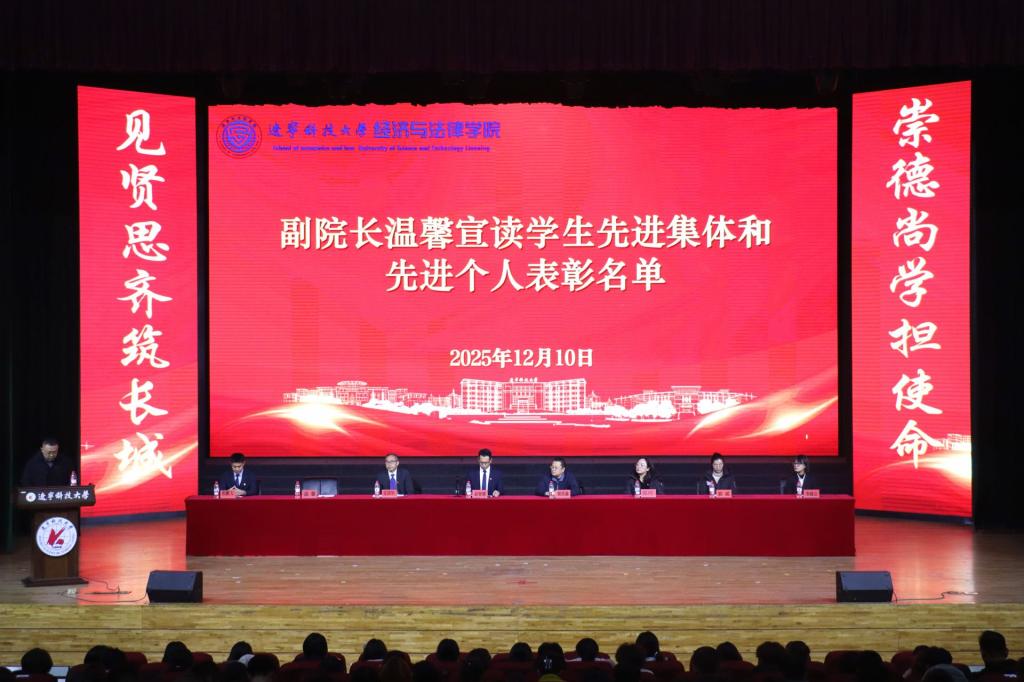 12月10日,经法学院在校礼堂隆重举行2025年度学生工作表彰大会。会议由经法学院党委书记赵智博主持,院长郭浩淼、党委副书记张国华、副院长邵玲、副院长温馨、金融科技系主任郭威、学办主任李路云、团委书记张鹏飞及2023、2024、2025级全体学生参加。