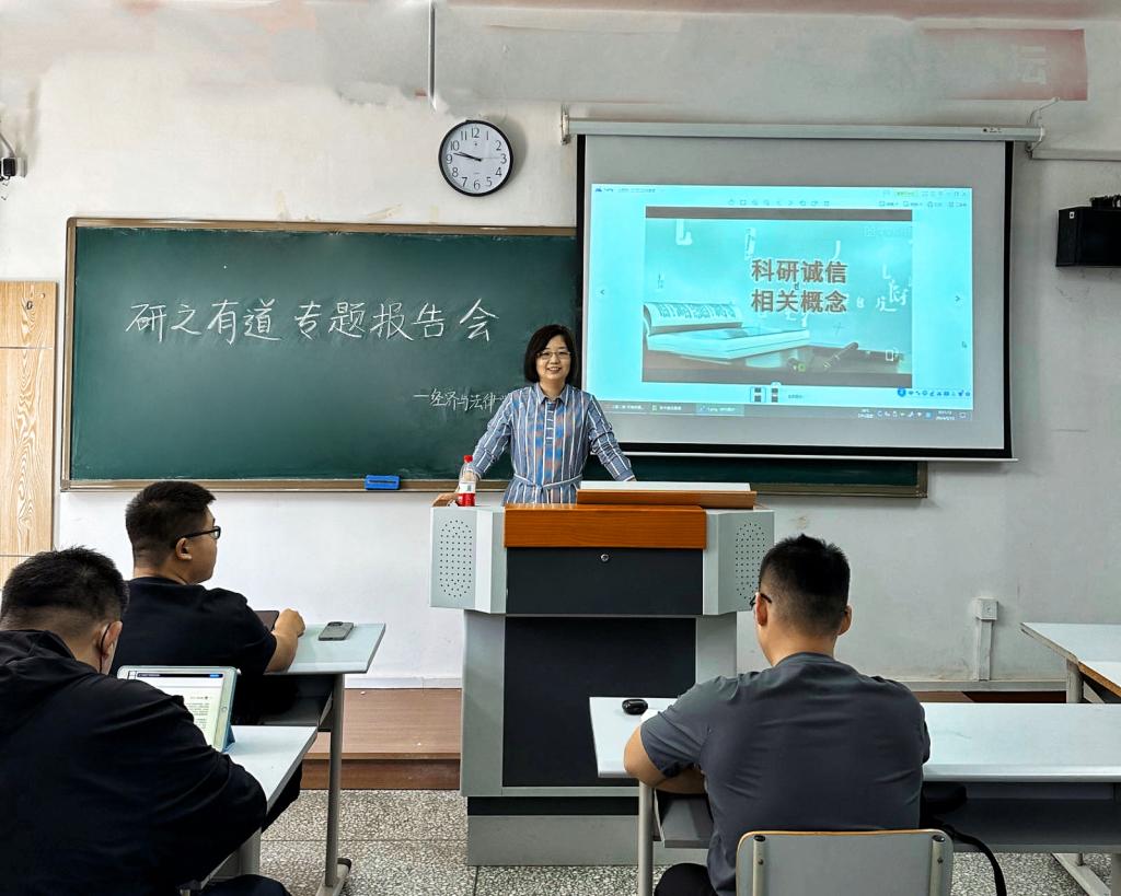 交流会上,武婷婷老师首先强调了科研诚信和学术规范的重要性。随后,她结合自身丰富的科研经验,从研究选题、文献综述、研究方法选择、数据分析以及论文撰写等方面,详细介绍了学术研究的整个流程。在师生互动环节,法硕研究生结合近期的学习经历和体会,围绕未来的就业方向、职业规划、申博考博等问题进行了提问,老师一一进行了耐心解答,给出了针对性、前瞻性的建议,同学们收获颇多。会议最后,武婷婷老师寄语法硕学子:珍惜校园时光、锻炼本领、砥砺前行!