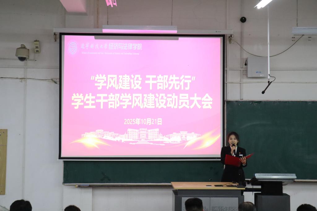 10月21日,经法学院于博学楼C202召开2025年“学风建设 干部先行”学生干部学风建设动员大会。学院党委书记赵智博、党委副书记张国华、学办主任李路云、团委书记张鹏飞及250名学生干部出席会议。大会由分团委组织委员任芷瑶主持。