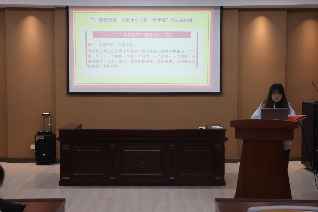 宣讲会上,王莞舒以深刻领悟习近平总书记的青年观,争做新时代新青年为主题,从时代、理论、价值、实践四个维度带领同学们深度解读其主要内容,引导学生深刻认识习近平总书记青年观的理论与现实意义。她指出,大学生作为新时代发展的中坚力量,应坚定理想信念、敢于挺膺担当、甘于吃苦耐劳也要肯于拼搏奋斗,在推进强国建设、民族复兴伟业中展现青春作为、彰显青春风采、贡献青春力量。