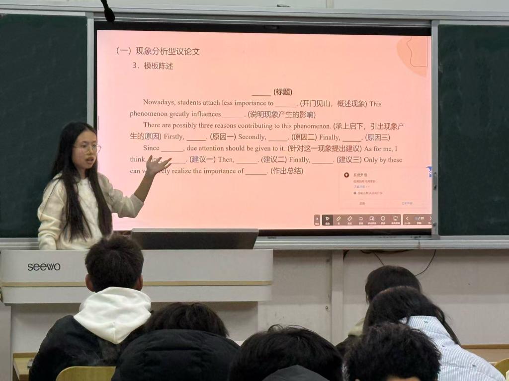 首先,是金融232班的尹红霄同学,她英语能力出众,已高分通过英语四、六级,斩获多项省级英语赛事荣誉,同时担任学校帮帮团英语教员。本次辅导课她不仅重点梳理了英语写作方法、写作分题型技巧、听力理解的知识点,还提出了如何写出多种句型的方法以及如何抓取听力关键词,助力同学们构建清晰的知识体系,提升写作与听力能力。