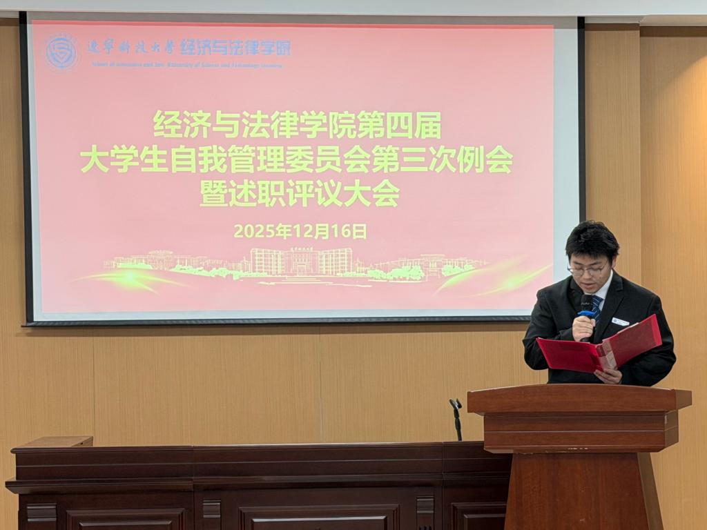 12月16日,经法学院于博识楼A402召开第四届大学生自我管理委员会(以下简称自管会)第三次工作例会暨述职评议大会。学院学办主任李路云出席本次大会,会议由经法学院自管会执行主席刘鑫喆主持,第四届自管会全体成员参加了本次会议。