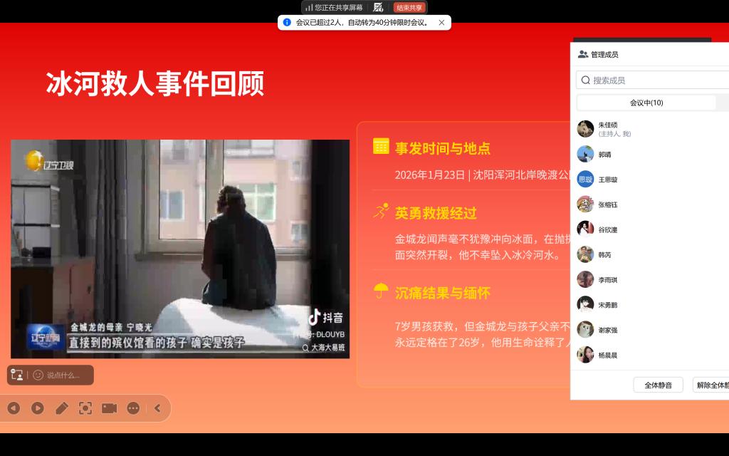 在事迹分享环节,各团支部书记带领支部成员观看金城龙同志先进事迹纪录片,聆听其师长、亲友及社区工作者的深情讲述,全面了解他忠诚担当、无私奉献、乐于助人的高尚品格。大家被他临危不惧、舍己为人的英雄气概,以及始终心怀家国、服务他人的精神追求深深打动。