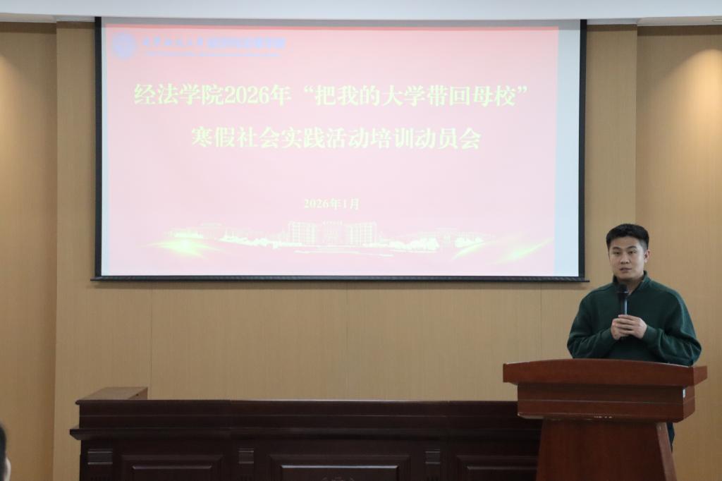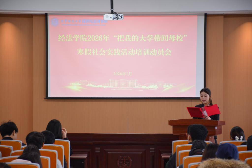 近日,经法学院于博识楼A402召开2026年寒假“把我的大学带回母校”社会实践活动培训动员会。会议由姜懿轩主持,学院团委书记张鹏飞、团委学生副书记袁萌出席会议,120余名学生参加。