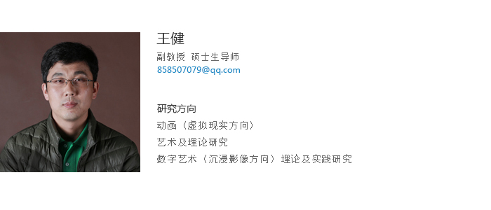 王健副教授,艺术教育学博士。有动画(虚拟现实方向)与数字艺术(沉浸影像方向)研究经验。近年来发表学术论文20余篇,其中核心以上论文5篇;出版教材3部,参与省级教改1项,主持省级教改课题1项,省级社科基金项目1项,鞍山社科基金项目多项,校级青年基金项目1项,主持横向科研课题项目4项。曾获校青年教师课堂大赛一等奖、校级教学成果奖二等奖、校级研究生毕业论文优秀指导教师;中国电影剪辑学会短片短视频艺委会理事、数字媒体艺术动画专委会理事。