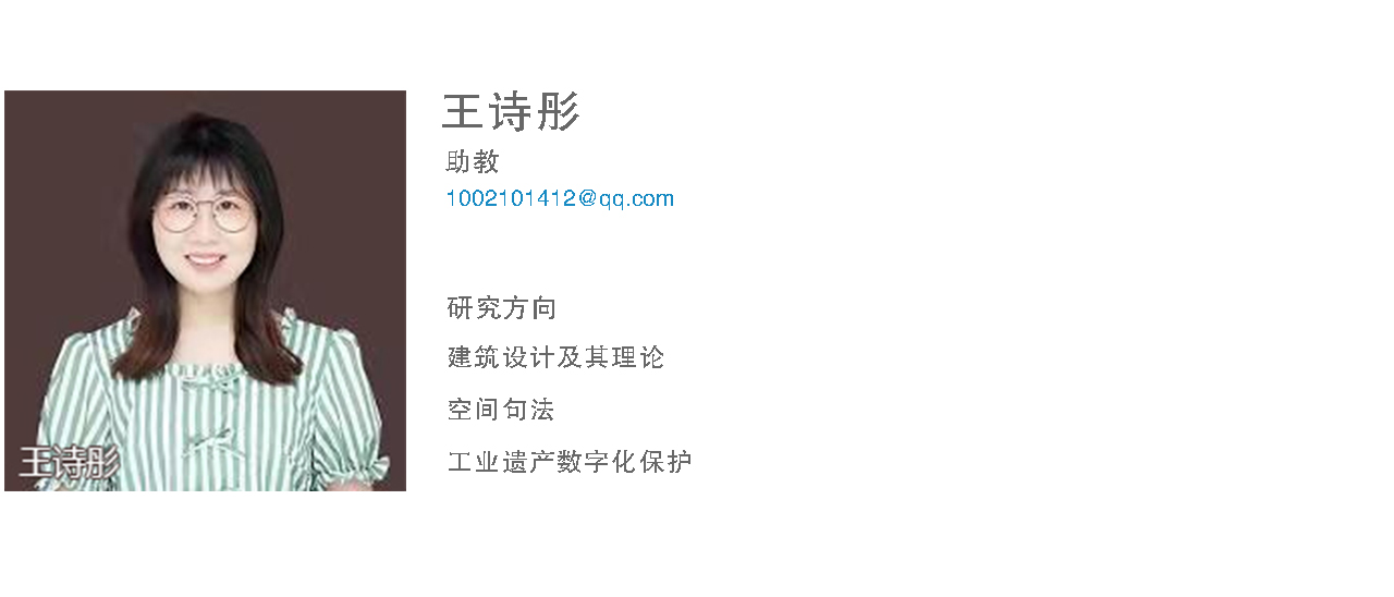 王诗彤,助教,2020年6月毕业于沈阳建筑大学,取得建筑学硕士学位,在校的学习研究方向为建筑区域空间关联度数据分析以及空间句法的研究,发表论文《基于空间句法的江南私家园林空间序列量化研究》,阐述了游人行为与空间数据之间的关系,毕业后曾在建筑设计设计公司工作,具有一定的实践经验。
