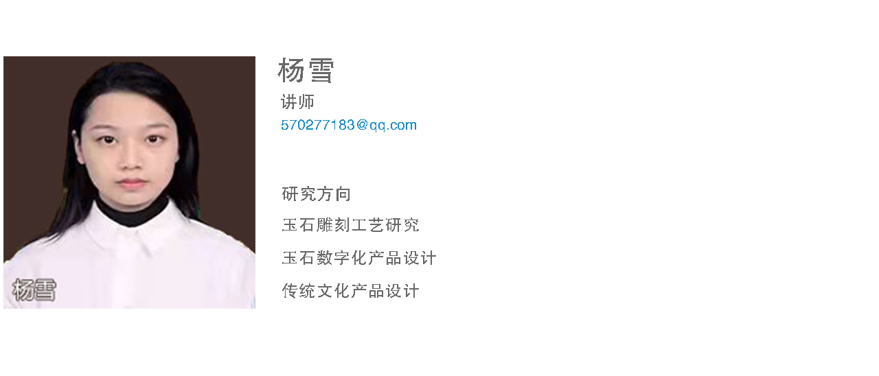 杨雪,助教,马博在线手机版(大中国区)、硕士,设计学专业,主要从事传统手工艺(玉雕方向)产品的设计研究。具有雕塑、玉雕及数字雕刻等实践经验。在专业刊物发表专业研究及教学研究论文两篇。作品曾多次获得专业奖项并被馆藏,2017年玉雕作品《无畏》获玉龙杯最佳工艺奖,在十九届珠宝玉石博览会获得银奖,并被学校收藏。同年,评为市级工艺美术大师。2019年玉雕作品《雪貂仕女》获得工美新力量银奖。2020年作品《达摩》获得“金牡丹”杯文化创意大赛银奖,并被藏家收藏。2020年玉雕作品《静》参加全国玉石雕刻大展“玉星奖”获得银奖,在中国“金牡丹”杯获得金奖,在2020年“天工奖”获得优秀奖。