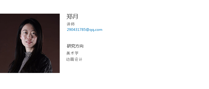 郑月讲师,硕士研究生,辽宁师范大学、美术学专业毕业。中国传媒大学动画专业进修 。具有多年动画专业教学经验,先后在中文核心期刊和外文期刊上公开发表论文3篇,发表省级教研论文十余篇,主持完成动画专业课程考试改革1项,参与社科繁荣项目及青年基金等项目3项。任教期间指导本科生大学生创业创新计划项目1项;指导本科生发表科研论文十余篇。指导学生参加中国大学生广告艺术节学院奖、全国大学生广告艺术大赛等多个专业比赛并获奖。