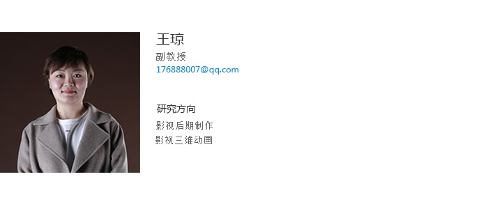 王琼,副教授,硕士研究生毕业于辽宁大学艺术学专业,具有多年辽宁电视台工作经验,先后在国内外期刊公开发表学术论文20余篇,其中EI检索2篇,中文核心5篇;参与撰写国家十二五规划教材;主持省级科研1项,参与省级基金项目多项;获校创新创业教学大赛二等奖;指导学生在全国大学生计算机设计大赛等国内多项专业比赛中获得奖项