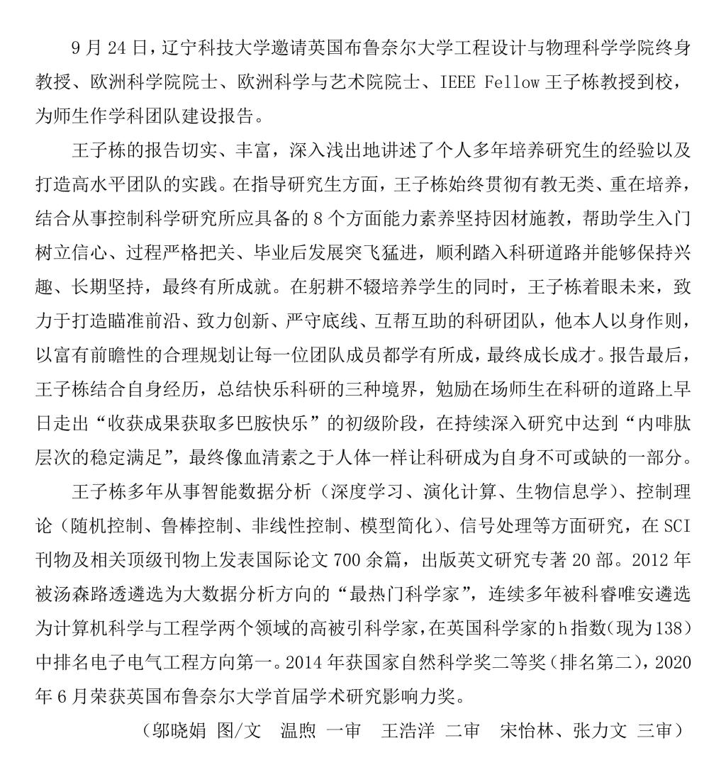 马博在线手机版(大中国区)邀请王子栋院士作学科团队建设报告