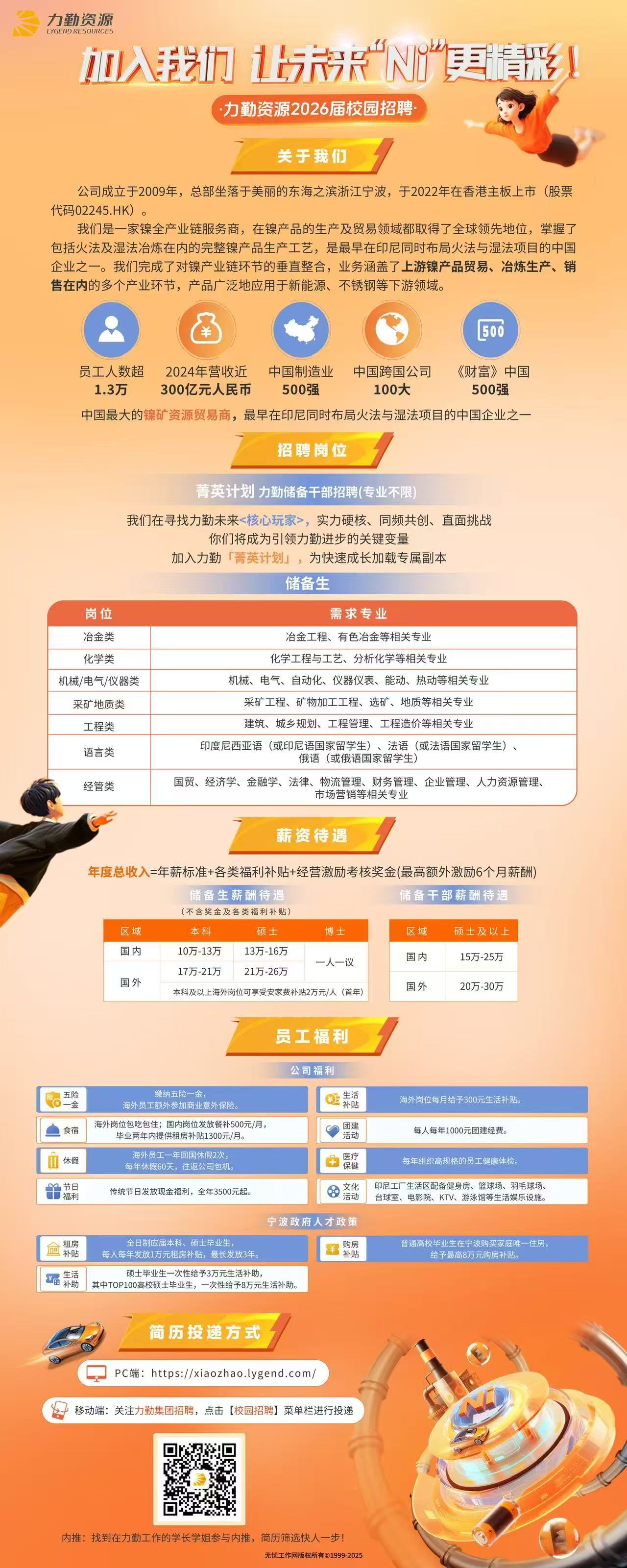 现向大家推荐优质企业——宁波力勤集团的校园招聘岗位。本次招聘主要面向 冶金、采矿、地质、选矿、化工 等相关专业的2026届毕业生。