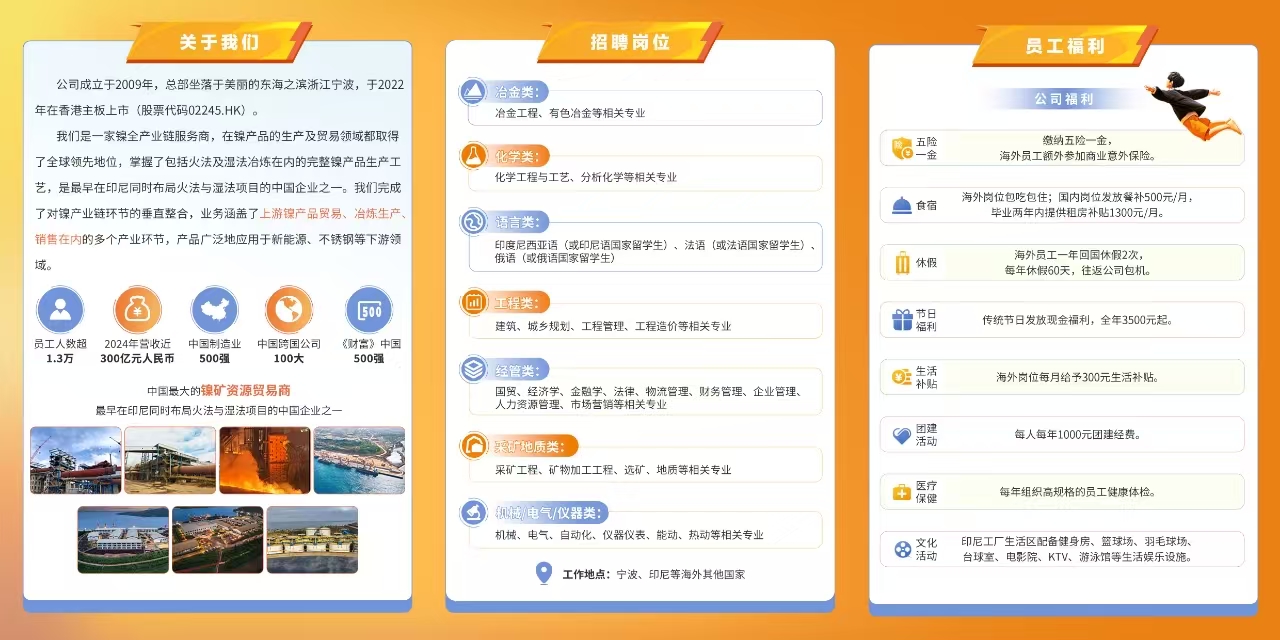 该公司为全球领先的镍资源供应商,平台广阔,发展前景良好,并为员工提供极具竞争力的薪酬和完善的福利保障。
