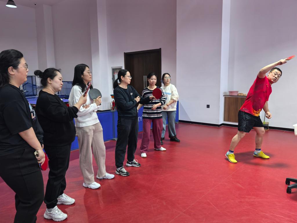 本次活动邀请了校乒乓球协会主席关学伟老师为大家开展了别开生面的乒乓球教学活动,关老师为大家讲解了乒乓球握拍姿势、挥拍的基本动作和步法,并亲自上阵实战指导教学,不仅激发了老师们对乒乓球的浓厚兴趣,也让大家在紧张的工作之余得到了放松,享受轻松愉快的氛围。