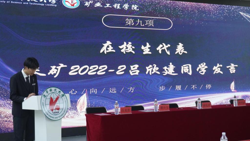 采矿 22-2 班吕欣建作为在校生代表发言,他难掩激动与不舍,向即将踏上新征程的学长学姐们致以最诚挚的祝福。他表示,作为在校生,他将以学长学姐为标杆,努力学习专业知识,积极参与实践,传承矿业人的精神,不负学院的培养与期望,也希望学长学姐们在未来一帆风顺,常回母校看看。