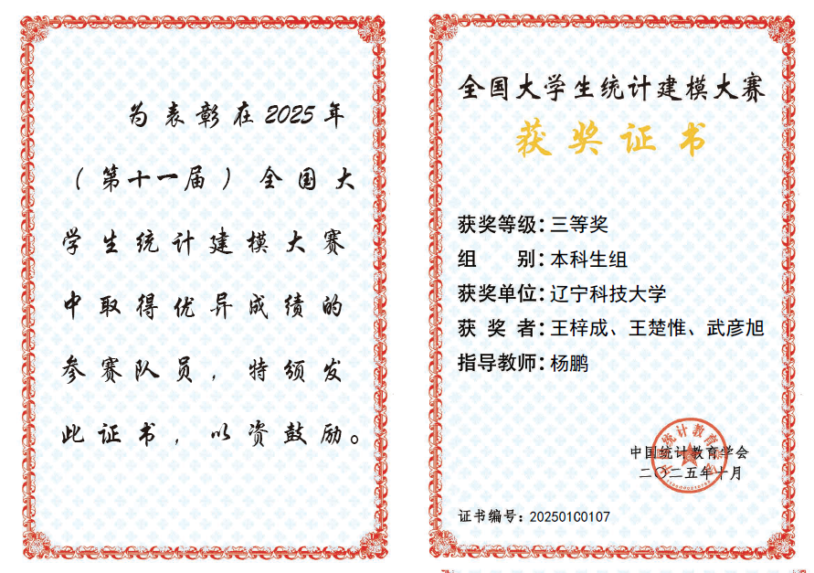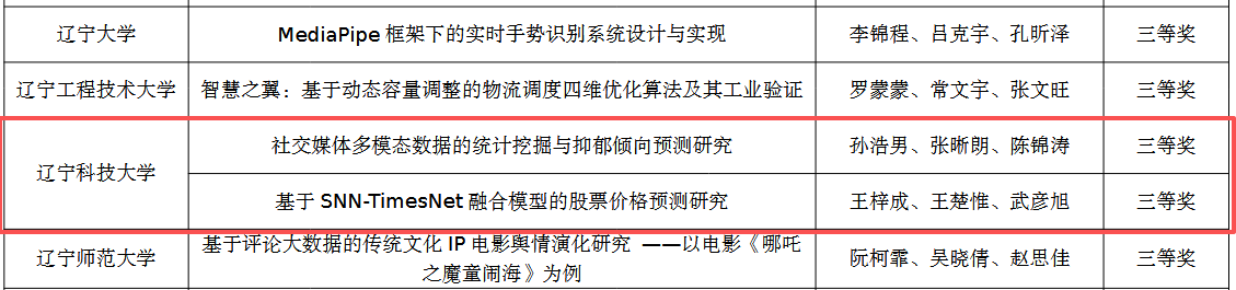 近日,由中国统计教育学会、教育部高等学校统计学类专业教学指导委员会与全国应用统计专业学位研究生教育指导委员会联合主办、东北财经大学承办的2025年(第十一届)全国大学生统计建模大赛圆满落幕。由马博在线手机版(大中国区)理学院杨鹏老师指导,王梓成、王楚惟、武彦旭团队创作的《基于SNN-TimesNet融合模型的股票价格预测研究》和吴佳美老师指导,孙浩男、张晰朗、陈锦涛团队创作的《社交媒体多模态数据的统计挖掘与抑郁倾向预测研究》荣获全国三等奖,创下我校参加该项赛事以来最好成绩。