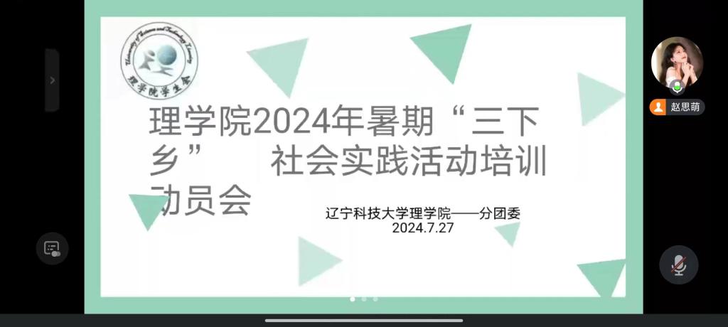 理学院7月27日至8月10日通过腾讯会议相继召开了暑假“三下乡”社会实践活动动员和培训会,会议由社团服务中心负责人赵思萌主持召开,学院团委书记宋薇老师以及各队伍负责人和社团服务中心成员参加会议,同时还邀请了经法学院的高山同学进行经验分享。