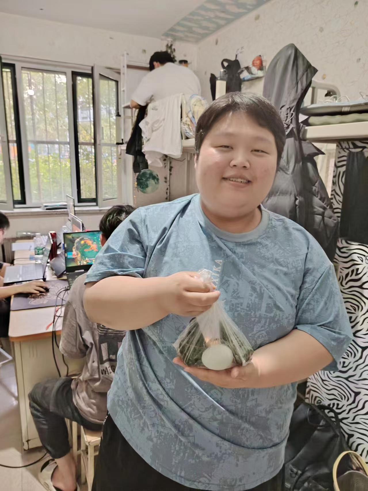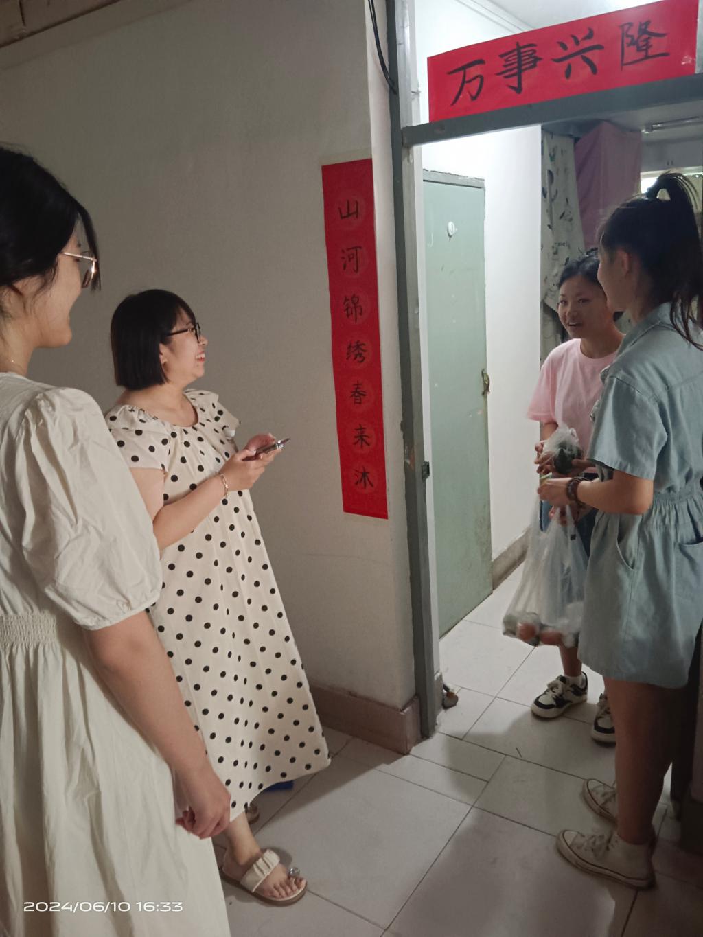 活动当天,学生会干部们早早地准备好了新鲜的粽子和鸡蛋。每一颗粽子都蕴含着浓浓的节日气氛和深深的祝福,每一个鸡蛋都象征着健康与希望。他们带着这些满载心意的礼物,走进了宿舍,走进了每一位贫困生的心田。