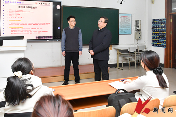 在博学楼C404教室,胡军听取了理学院教师孙超讲授的“概率论与数理统计”课程。课上,孙超结合学生专业背景引入相关案例,通过提问引导学生思考,师生互动活跃。课后,胡军与授课教师亲切交流。他勉励教师要以严谨治学的态度站稳讲台、以言传身教的力量感召学生,引导学生端正学习态度、严守学术规范,在潜心治学中助力学生成长成才。同时,他鼓励教师注重因材施教,不断创新教学方式方法,激发学生内在学习动力,营造教学相长、追求卓越的浓厚学习氛围,涵养创新人才成长的沃土,为学校事业的高质量发展注入持久动力。