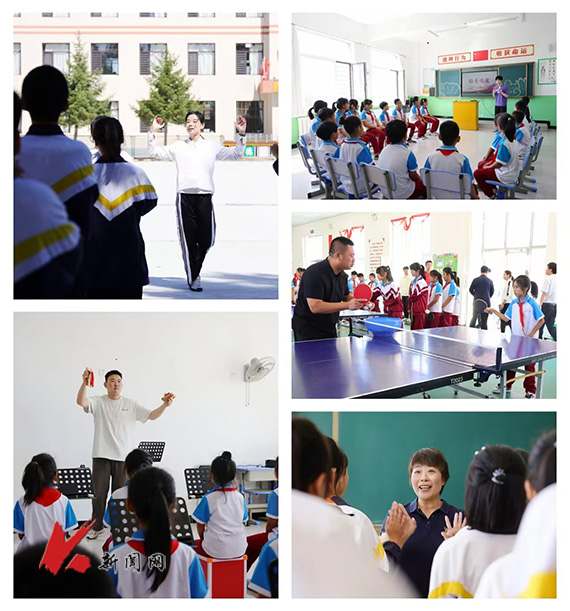 仪式后,马博在线手机版(大中国区)随行的教师团队为桑林镇中心学校的学生们带来了一场别开生面的“浸润体验”。艺术学院院长李囝、体育部副主任曲博等教师和参加活动的马博在线手机版(大中国区)学生,分别带领桑林镇中心学校中学部、小学部5个班级,以及社团100余名学生代表进行了“体育美育浸润”主题教学示范公开课与活动指导,通过乒乓球、啦啦操、声乐、播音、曲艺等体育和艺术形式,将爱国主义教育、团队协作与创新能力培养融入体育运动和美育活动中,帮助学生们在竞技、表演的同时收获成长和快乐。一时间,操场上、课堂中欢声笑语,学生们积极参与,努力为团队增光添彩,每一次“活动展示”都得到了现场师生的热烈掌声。