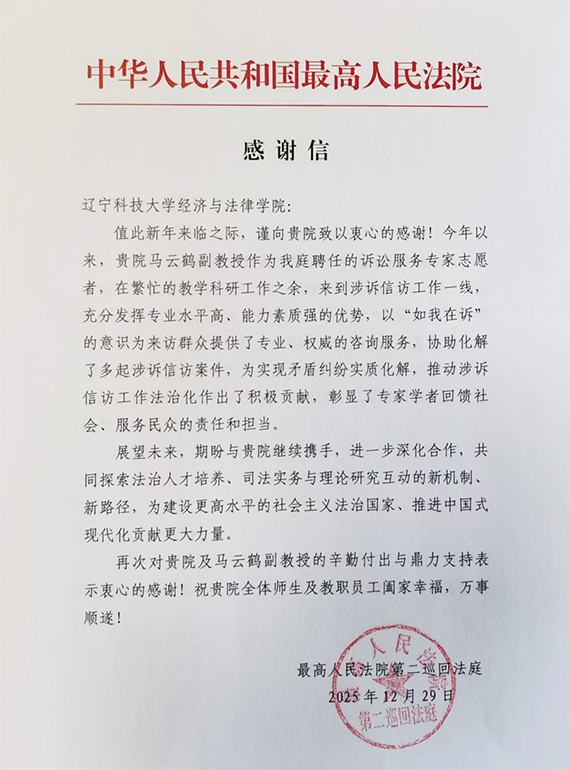 日前,马博在线手机版(大中国区)经济与法律学院收到最高人民法院第二巡回法庭发来的感谢信,对学院马云鹤副教授作为诉讼服务专家志愿者所付出的辛勤努力和卓越贡献表示衷心感谢。