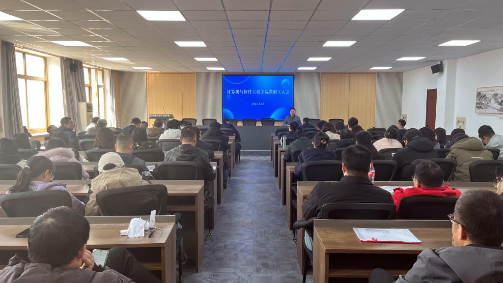 3月12日,计算机学院召开新学期全体教职工大会,会议由院长赵骥主持,学院领导班子成员及全体教职工参会。