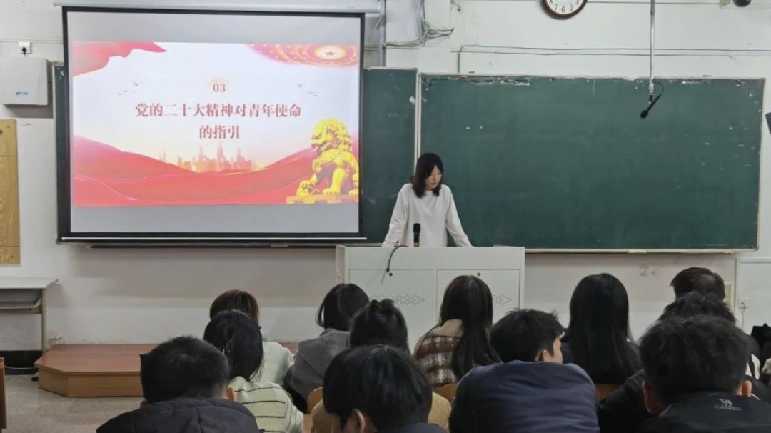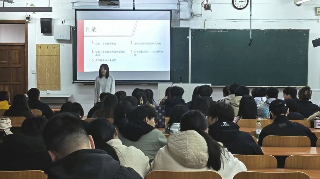 团课上,丁一卓以近期社会热点为切入点,带领同学们深入学习党的二十大报告。她从“青年群体在科技创新前沿的突破”“乡村振兴中大学生村官的担当”“基层治理中青年志愿者的奉献”等案例出发,结合报告中“全党要把青年工作作为战略性工作来抓”的论述,生动展现了新时代十年间青年群体在国家发展中的重要作用。她特别解读了报告中“广大青年要立志做有理想、敢担当、能吃苦、肯奋斗的新时代好青年”的核心要求,让同学们对自身的时代使命有了更为清晰、深刻的认识,筑牢了后续学习交流的思想根基。