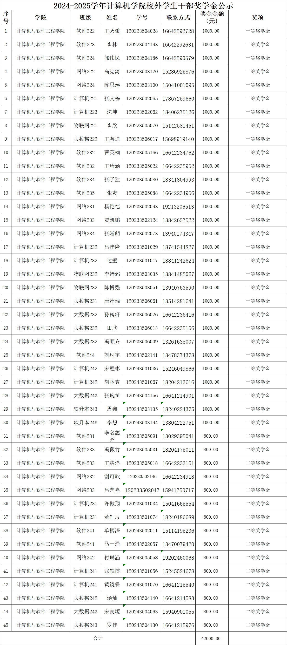 2024-2025学年计算机学院校外学生干部奖学金公示