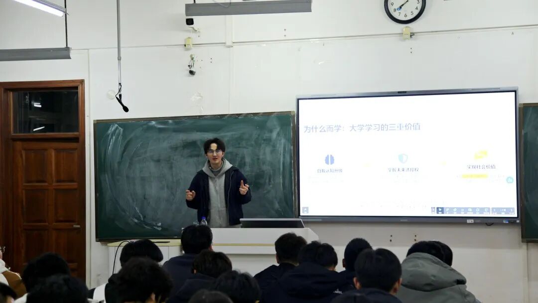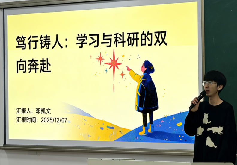 邓凯文聚焦“成绩-自信-兴趣”正向循环构建,分享了破解负向学习链条的感悟,详细讲解了与老师高效沟通、向学长汲取经验的技巧,毫无保留地交流了“主动联结促成长”的心得,鼓励同学们从小目标切入积累正反馈,筑牢科研根基。他鼓励同学们以问题为导向,通过课前预习、课中深耕、课后拓展的闭环,加入实验室或社团沉淀实操经验,实现学习与科研的相互赋能。