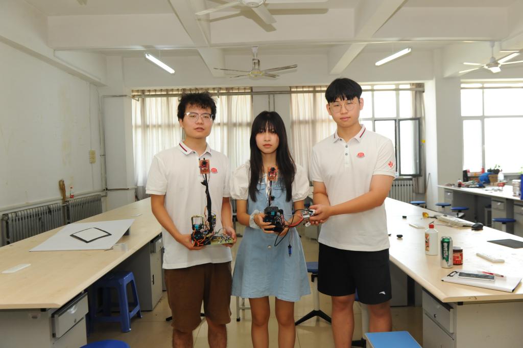 在学习中不断积累,最终实现技术突破。“比成绩更重要的是参赛过程中能力的提高和作品的突破和创新,这才是比赛背后最大的意义。”余胤翔认为。往年的比赛,为了求稳,选手们大多使用动态图像处理方法完成作品。如此一来,作品运动缓慢、零件间必须相互作用,如果其中一处出现问题,整个作品就将停止运动的问题就会显现出来。本次比赛,团队三人不谋而合,决定大胆突破创新、挑战自我,尝试采用静态图像处理方法完成比赛。想法虽好,但也需要实力“加持”,平时学习的积累和各种比赛锻炼的优势在这个时候就显现了出来。就这样,三个人通过查阅相关资料,边学习摸索,边研究制作作品模型,难度可想而知,脚步却不曾停止。不断试错纠错的过程中,团队惊喜地发现,静态图像处理方法相对于动态图像处理方法不仅在图像处理方面难度大大降低,更为以后的制作工作节省下了更多的时间。作品初步完成后,进行的初步测试让大家信心倍增:系统模型行动敏捷自如、完成规划路线耗时大大缩短、图像处理和零件之间实现了两者独立,为整个系统留下了多余的空间。面对这个意外惊喜,团队乘胜追击,利用这个空间加固了整个装置的中心,从而消除了因装置过高容易导致重心不稳带来的隐患。最终,凭借这些独有的设计,作品以精巧、集成度高的优势脱颖而出,成功进入国赛。至此,三个人的小团队通过四天四夜的努力,最终实现了技术的突破。