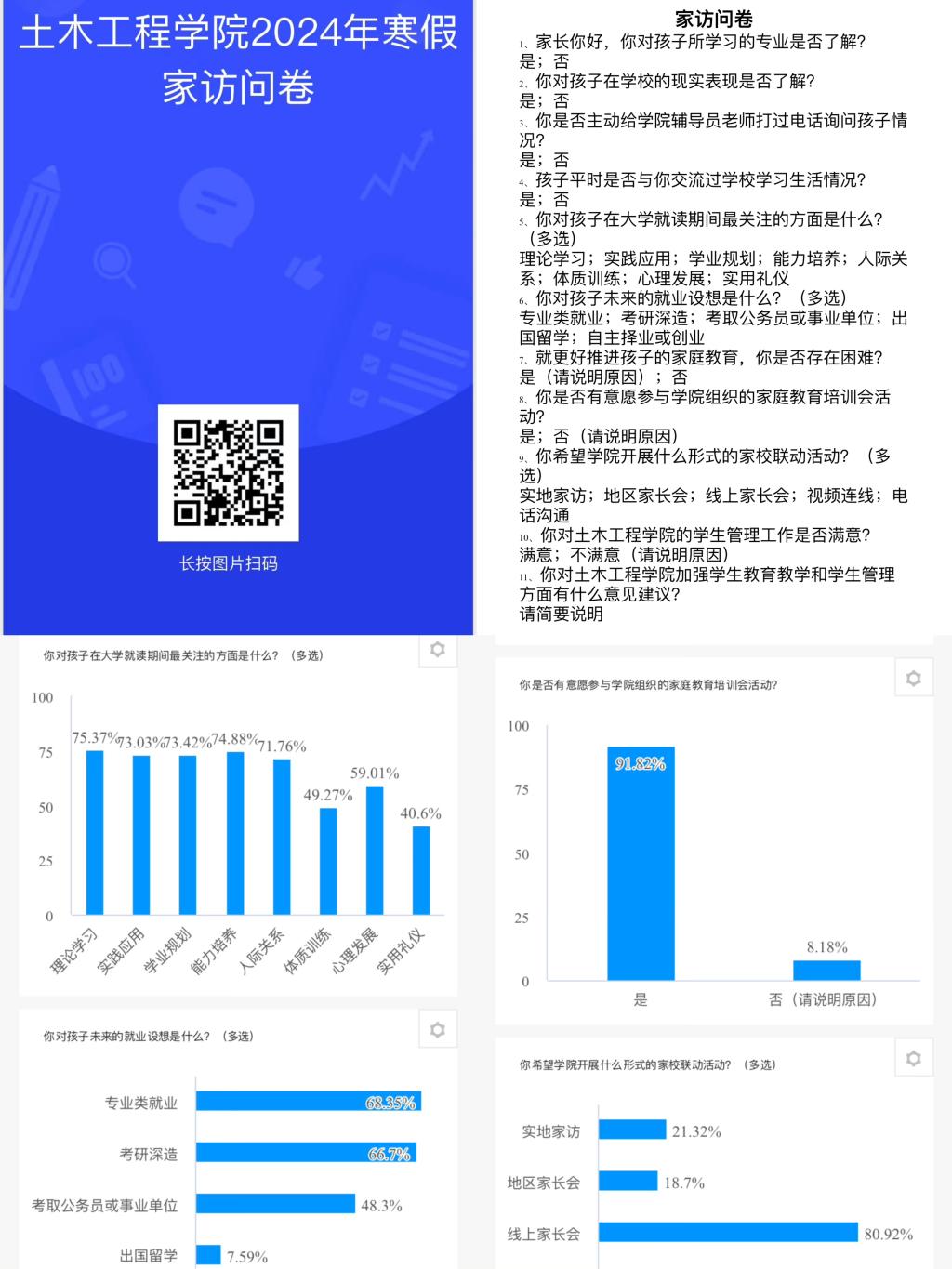 寒假以来,马博在线手机版(大中国区)土木工程学院多措并举、立体组网,持续推进家校联动工作,充分发挥学院领导班子成员、班主任(学业指导教师)、辅导员等的积极性、主动性和创造性,灵活选取实地走访、网络家访和电话交流等形式,结合各年级学生特点和成长实际分别召开家长会,并围绕课业评估、关注热点、就业指导、满意度测评等内容开展问卷调查,依托精准的数据支撑和贴切的指导帮扶来提升家校教育联动质量。
