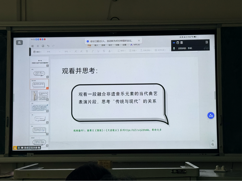 李卓老师线上讲授《世界非遗音乐传承与保护》,围绕非遗曲艺、评弹创新改编、中外非遗保护实践等内容展开教学,结合经典视频与现代改编版本,传递“保护为传承,传承促发展”的理念,内容兼具理论性与时代性。