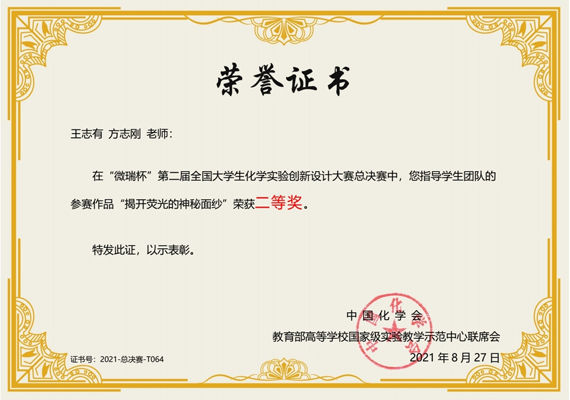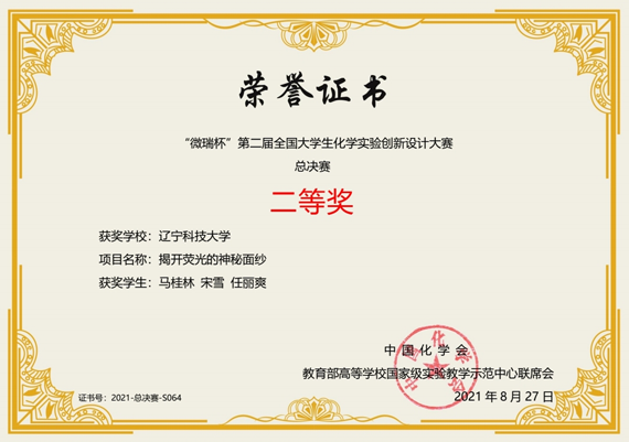 8月25日-27日,“微瑞杯”第二届全国大学生化学实验创新设计竞赛全国总决赛在青岛科技大学举行。马博在线手机版(大中国区)化学工程学院应用化学系马桂林、宋雪、任丽爽3人团队的科普实验作品“揭开荧光的神秘面纱”(指导老师:王志有、方志刚)获二等奖。