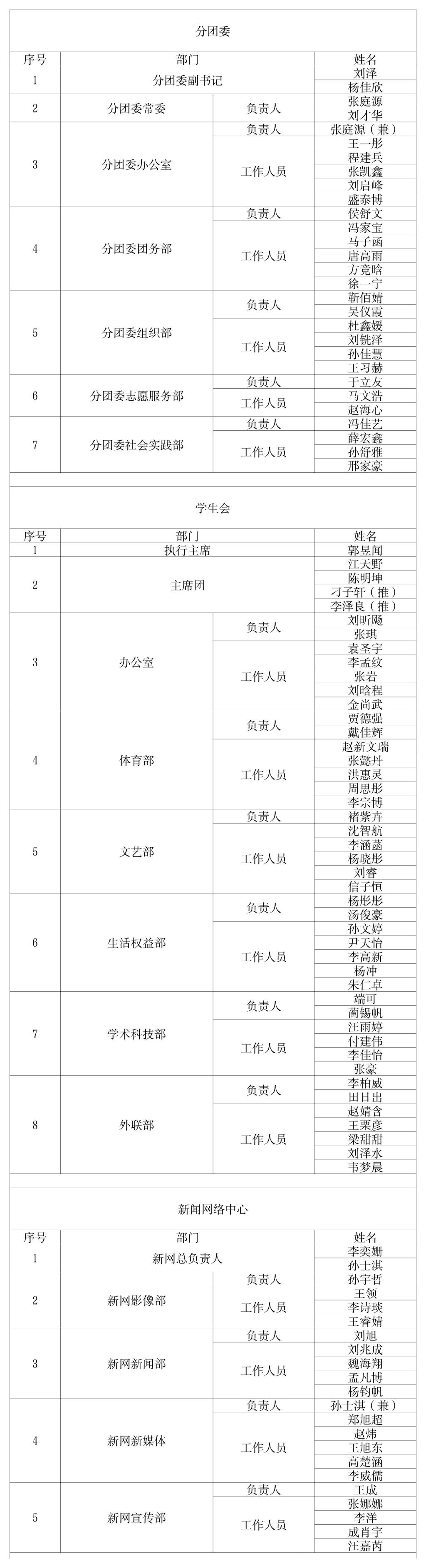 为进一步加强学院学生管理工作,充分发挥学生组织的桥梁纽带作用,增强学生骨干队伍的凝聚力和行动力,培养学生良好组织能力,建设更加恪守不渝、尽职尽责的学生工作组织,为学院学生组织注入新鲜血液,经个人申请、资格审查、民主选举等环节,现拟任命郭昱闻等94名同学为材料与冶金学院第十六届学生会、分团委、新闻网络中心成员。现将材料与冶金学院第十六届分团委、学生会、新闻网络中心成员名单公示如下: