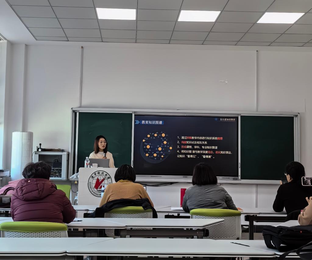培训邀请土木工程学院教师孙立霞授课。她向教师们详细介绍了知识图谱的三大核心功能,即智能关联与推荐、学情分析基础以及动态教学载体。同时,孙立霞还分享了智慧课程作为知识图谱“应用场景”的优势。