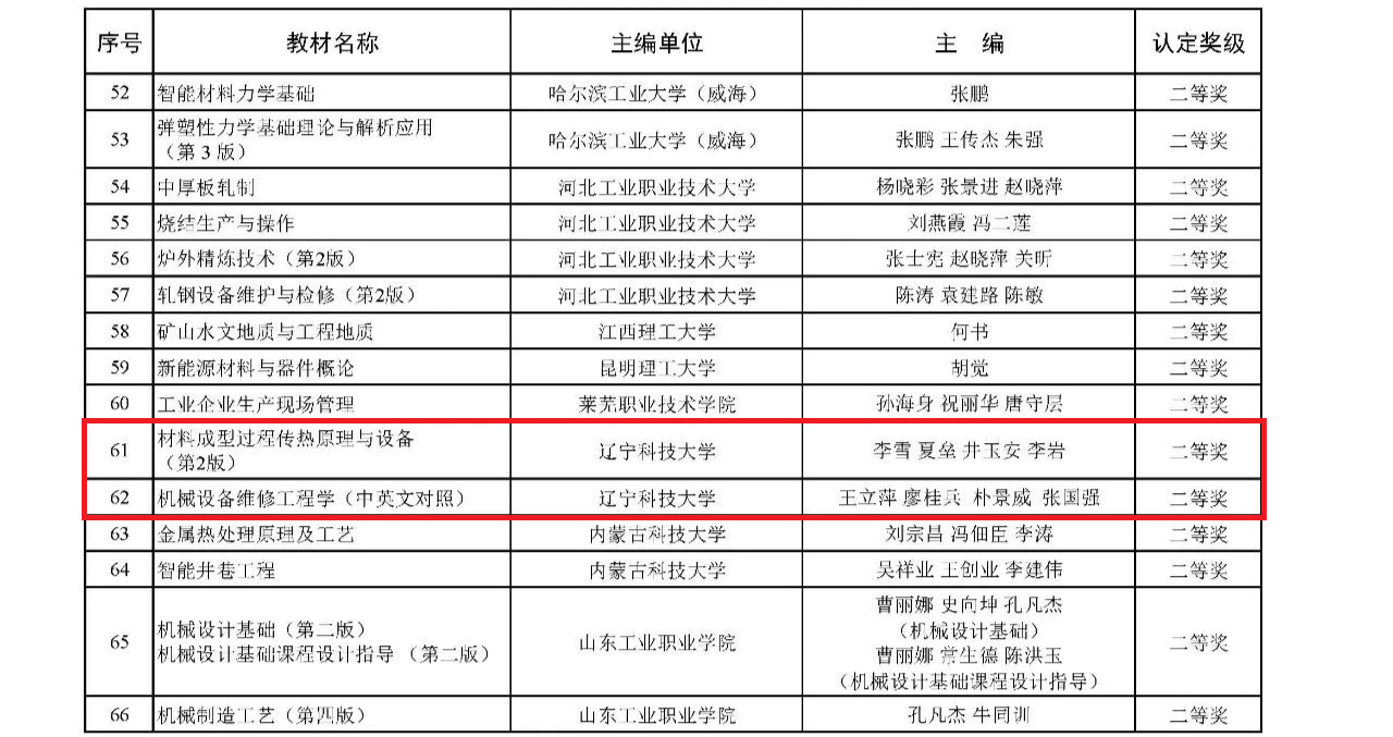 李雪、夏垒、井玉安等主编的《材料成型过程传热原理与设备(第2版)》和王立萍、廖桂兵、朴景威等主编的《机械设备维修工程学(中英文对照)》2部教材获二等奖,张铁志主编的《公路工程技能实训教程》,田雨泽、闫明祥主编的《土木工程施工技术与组织》,王丽、汪江主编的《图说外国经典历史建筑—18世纪末叶以前》3部教材获三等奖。此次获奖的5部教材涵盖了材料科学与工程、机械工程、土木工程等专业领域,内容丰富、特色鲜明,具有较高学术价值和教学实用性。它们凝聚了教师多年来教学经验和科研成果,也反映了相关行业最新发展动态和技术要求。